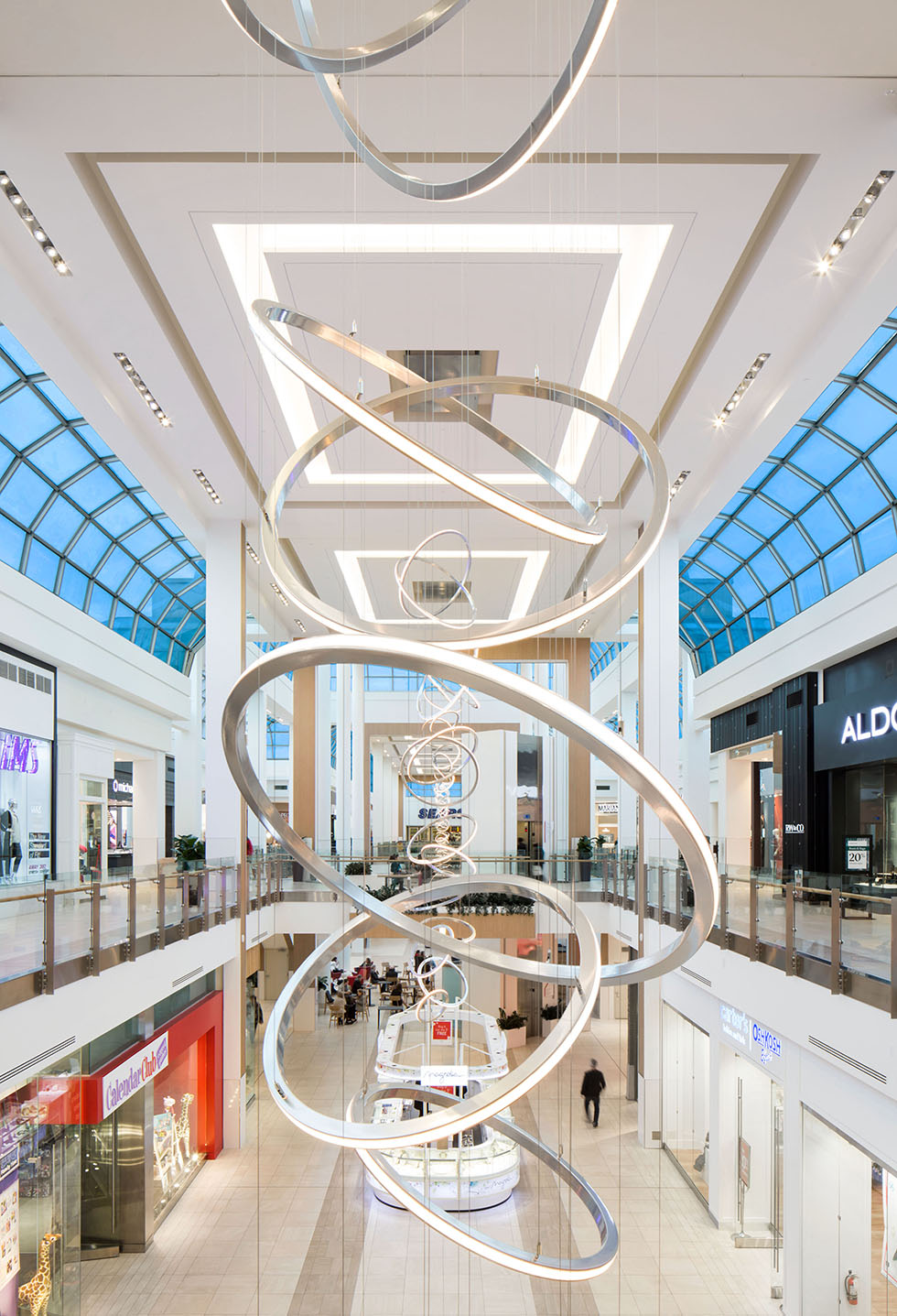 La rénovation du centre commercial Oakville Place visait à créer un environnement plus à la mode pour répondre aux besoins des clients plus haut de gamme d’Oakville. Une approche raffinée des détails a été développée pour améliorer le volume de l’espace. Une combinaison de plafonds en origami et de luminaires en cascade, sur mesure, sont les éléments signature de ce design.