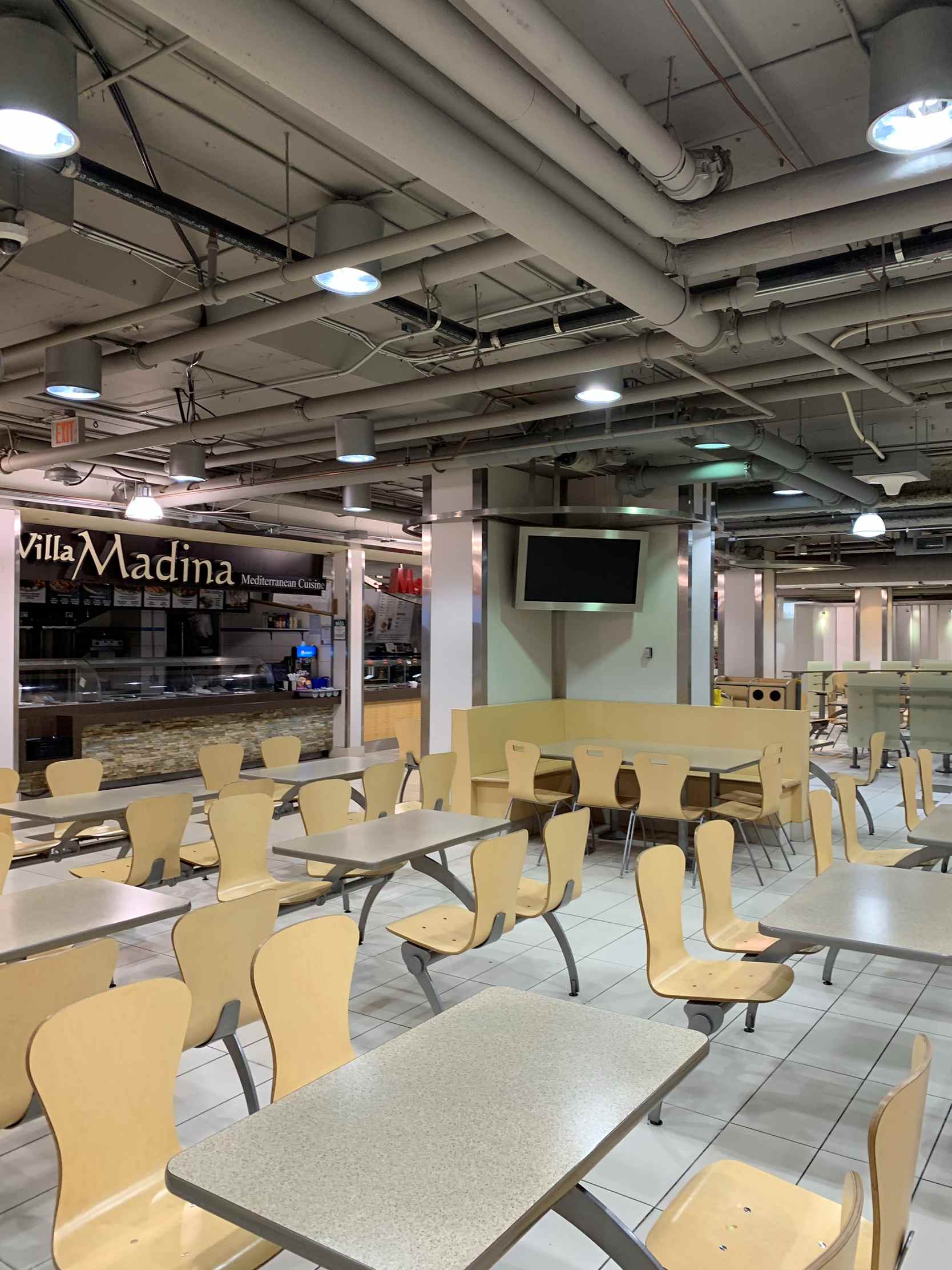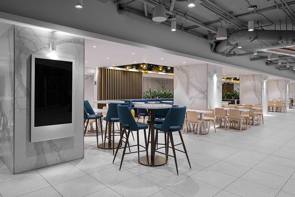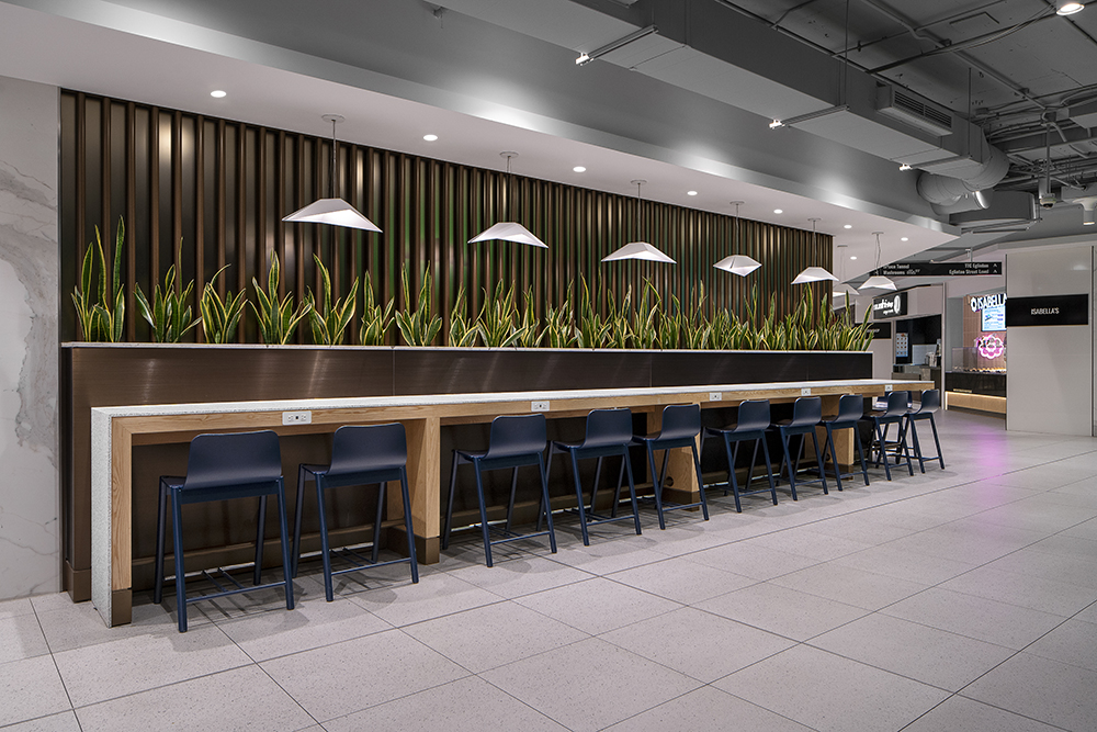 This subway-level urban dining hall underwent a complete transformation, revitalizing the space and elevating the customer experience. The combination of numerous large columns and a low, open ceiling had previously made the environment feel cluttered. The renovation focused on visually streamlining the space and creating a more cohesive, open atmosphere.